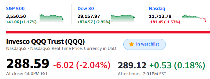 2020-11-10 S&P500+1.17%だがQQQは-2.04% 巣ごもり銘柄が売られる S&P500+1.17%だがQQQは-2.04% 巣ごもり銘柄が売られてQQQは大幅下落でした。円安も進んでいて、私の資産は一晩で166万ほど増えました。昨晩ほどの上げではないですが、それでも嬉しいです。 ↓↓↓こちをらのブログも是非ごらんください。